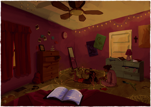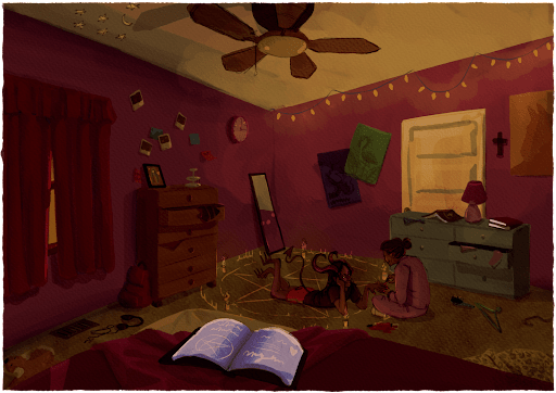 Last year I was going to apply for some scholarship competition, but I’m horrible at deadlines so I missed it. I couldn’t submit anything, so I just had a lot of art leftover that I was really passionate about. I still wanted to do something with them, and you’re supposed to have a theme for your whole portfolio. Both of the two works were a part of [the portfolio]. And [my theme] was Beauty and Monstrosity. Within “His Descent Was like Nightfall” there’s so much gore and tragedy in it. But also, one of the most revered pieces of literature, at least in Western literature, is the Iliad. And then “Girls’ Night” has a very different tone. For “Girls’ Night” — I love blasphemy. I just like the idea of a teenage girl locking the door of her room in a religious household and being best friends with the devil. I tried to include a lot of hidden religious imagery within the room, and I centered them on a seance circle. I like those clashing together.