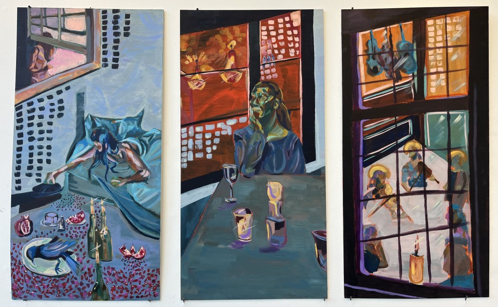 I’m thinking of the process of acrylic paint. The way I paint is a lot of layers on top of layers, and a lot of mixing. It’s sort of difficult to translate that into writing because they are two very different mediums. But when I’m thinking of the structure of stories, I think about them in terms of layers, and about how someone could read it this way and someone else could read it that way. So how do I paint something for both people to see. And sometimes I’ll be writing something and then have an idea for a painting and then go off with that.