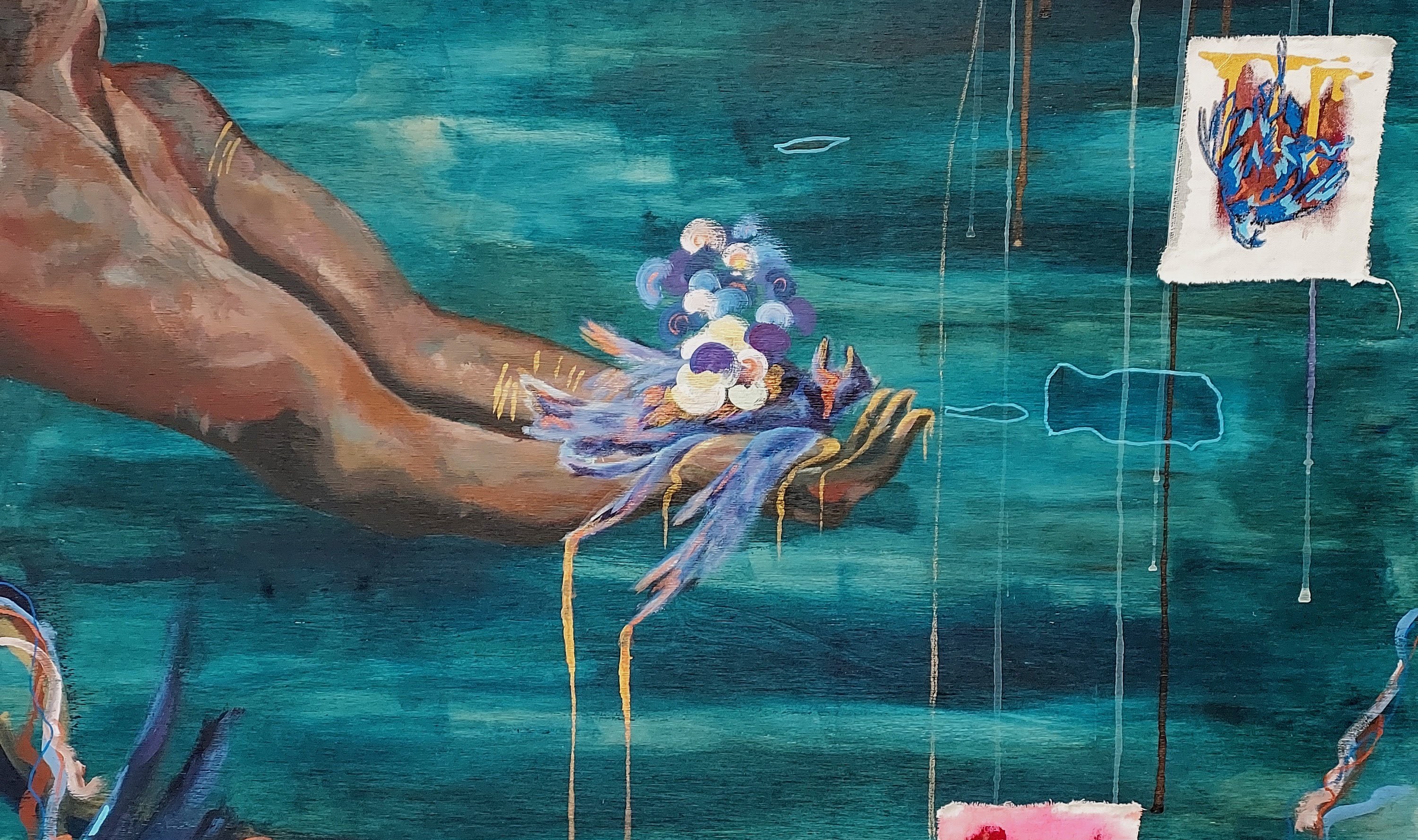 I’m thinking of the process of acrylic paint. The way I paint is a lot of layers on top of layers, and a lot of mixing. It’s sort of difficult to translate that into writing because they are two very different mediums. But when I’m thinking of the structure of stories, I think about them in terms of layers, and about how someone could read it this way and someone else could read it that way. So how do I paint something for both people to see. And sometimes I’ll be writing something and then have an idea for a painting and then go off with that.